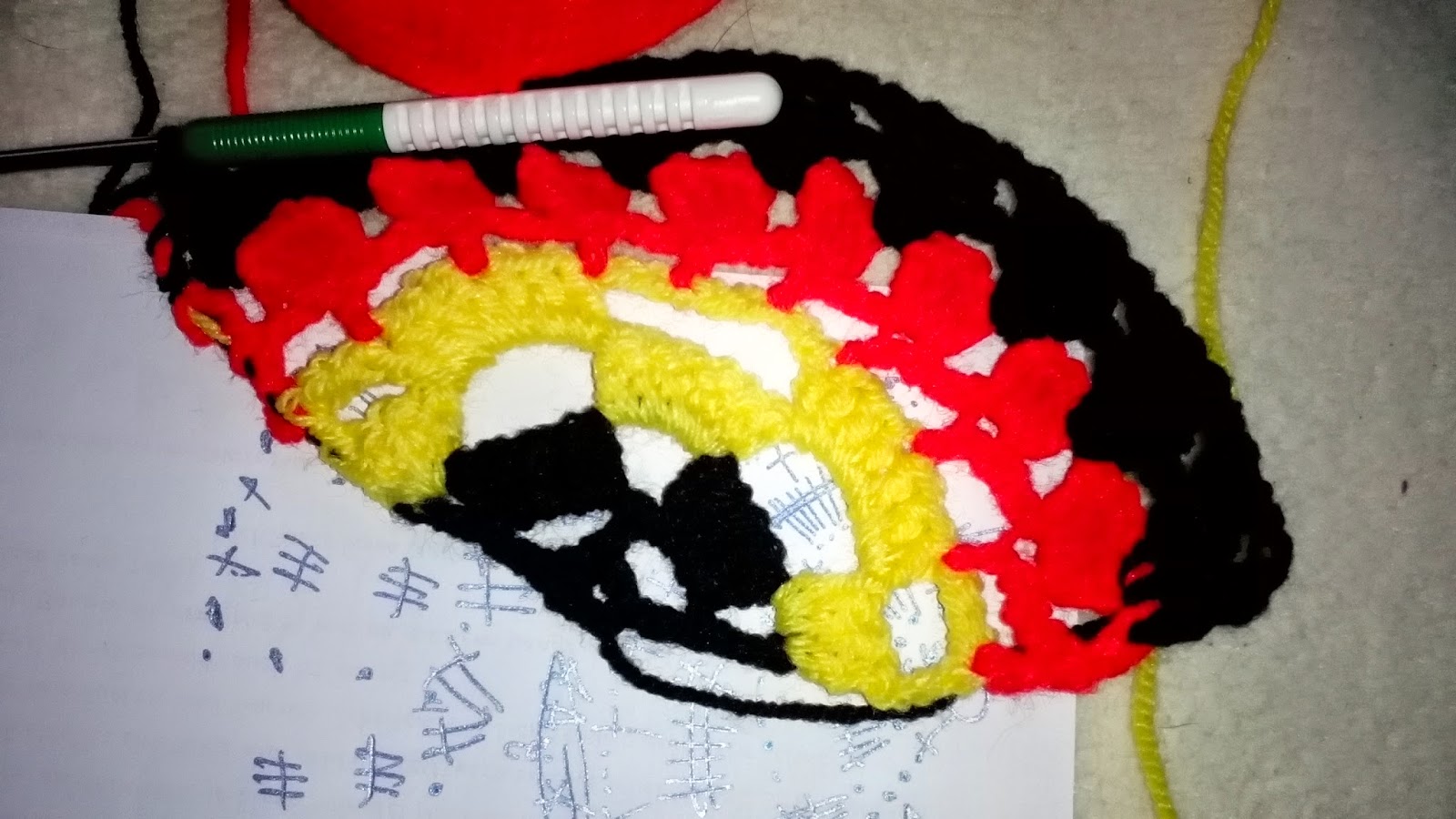 ... ich habe alle 3 Reihen die Farbe gewechselt und die Farben auch immer am Rand mitgeführt, damit ich nicht soviel vernähen muss...)